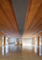 The multipurpose auditorium is built as a plinth beneath the entrance hall and can be opened up across the stage to a recessed area outside to the south. This stage can be used from both sides.