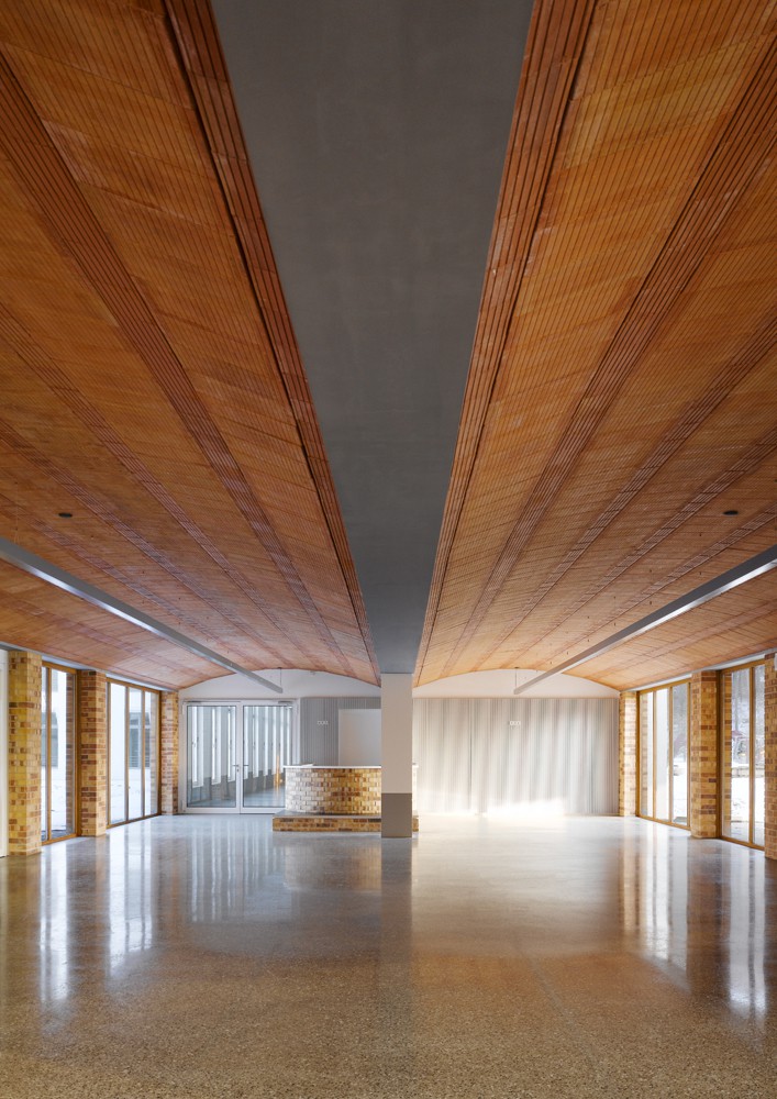 The spatial configuration of the entrance hall, of the staircase and of the open connection between the old building and the new school facilities is devoted completely to the building’s panoramic view. In contrast to the teaching building, which has light-coloured render like the existing building that it mirrors, the connecting structure, which includes the above-mentioned wall, is built entirely of brickwork or brick facing. This also applies to the ceiling construction, which is slightly vaulted. Its underside dominates the space and is, in turn, built as visible brickwork. The arches of the vaults can be seen across all the floors of the connecting building and create the impression of a multi-level loggia. This image determines the effect when seen at a distance from the lake. In that, we were guided by the question as to how the nunnery theme can be expressed in building.