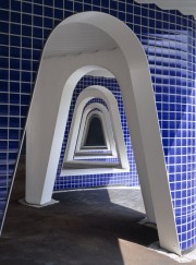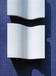 The new structure screens off the ensemble from a noisy street and constitutes the school campus’s keystone element. We set the hallway areas on the side towards the street, orienting the classrooms towards the schoolyard, which is now enclosed. On the southern side there is an adjoining wing, which connects the internal hallways with the old buildings. The closed-off façade fronting the street decisively establishes the image presented to the city. Inside the building, large shield-like winged shapes of white concrete form sitting alcoves opposite each classroom door. They channel light indirectly into the hallways and form a material contrast to the blue tiles specially developed for the school building. These tiles are part of the exterior insulation and finishing system, which thus gains a robust, stable and easy-care surface – which has in retrospect worked very well.