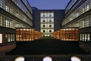 Along the street frontages, the outer edges of the block are closed off by office wings with double-loaded corridors. The entrance hall lies on the northeastern side, connecting directly with the old building and incorporating the depth of the office wings. A transverse connection links new and old, producing two inner courtyards: one is associated with the entrance hall and accessed from the transverse connection; the other accommodates a large staff restaurant.