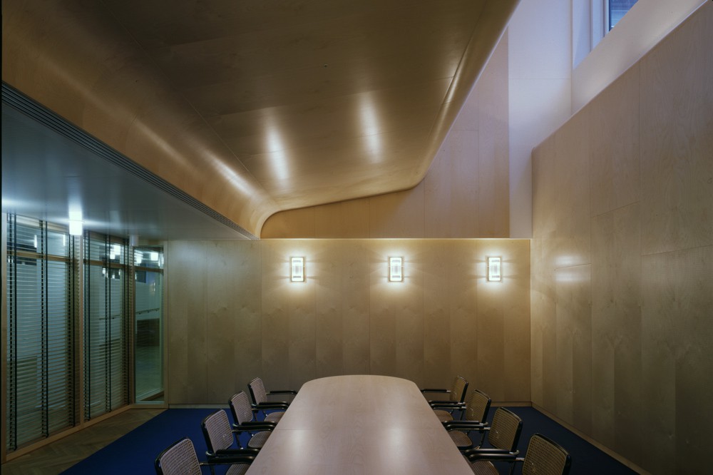 Matters of energy use play a special role for a firm of this sort. That gave us the opportunity to further develop the concept of construction materials with high thermal inertia, together with the associated notion of thermal mass as a storage medium. As with the tax office in Reutlingen, we turned to the concept of the apparently closed-off entrance hall. Accordingly, we reduced the amount of glass in the façade to what was absolutely necessary. The outer sashes of the box-type double windows are fitted with an ingenious opening mechanism that enables adequate ventilation of the rooms. Radiant panels hang from the ceilings and take over cooling and heating. In practice, however, the internal loads on their own are enough to heat the building. The building mass reacts with relative stability to temperature changes.