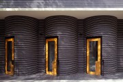 The inner courtyard accommodating the dining room rests on its own structural supports separate from the rest of the building and is visually dominated by a masonry barrel vault spanning 10 metres. The bricks have been left visible from inside and are loaded externally with a layer of concrete. Daylight enters the room via ceiling apertures set along the longer sides. The room is enclosed on three sides: on two sides by the kitchen and ancillary rooms, as well as by additional guest dining rooms beneath the northeastern office wing.