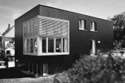 The House K. is the last constituent of a housing estate on the edge of the city, lending it urban planning significance in its surroundings. Its appearance is determined by the black stained wooden cladding enclosing the whole structure. We chose this colour as an allusion to a great number of wooden clad houses from the 1920s. Very close to the site was one such building, which by dint of its contrast between light-coloured wooden windows and dark wooden walls looked impressive, but still came across as amiably diffident.