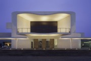 To ensure smoke extraction from the lower foyer, we set up a row of individual chimneys clad in white metal on the projecting terrace, which flank the entrance structure like a line of pillars. They are illuminated in the evenings and, together with the exterior stage which stretches right across the entire width of the building, they form a setting which does indeed connect it to the city.