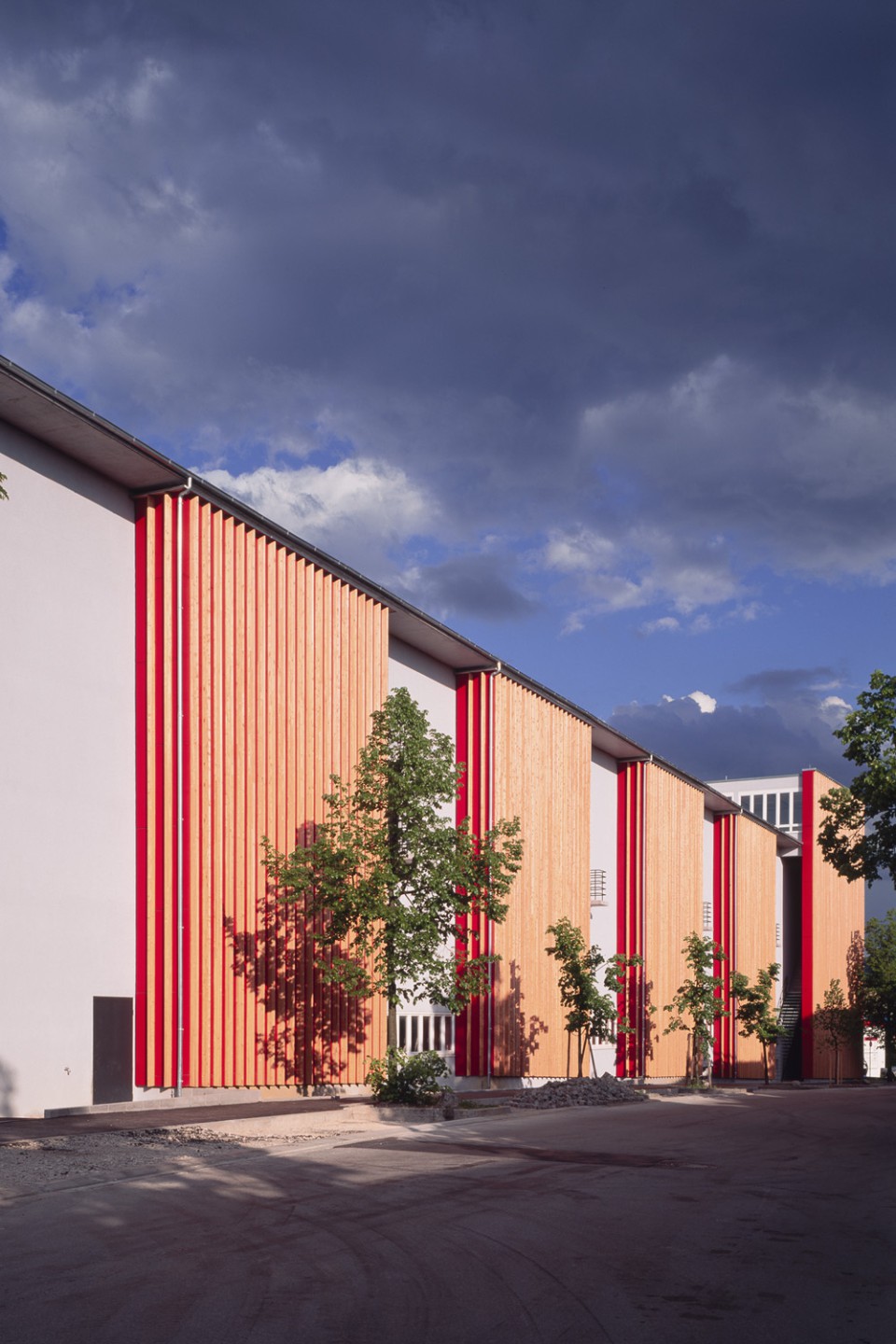 The administrative building has light grey rendering. From a design standpoint, the entrance hall forms a single entity with the adjoining warehouse: its façades are clad with red wood-based panels and vertical glulam battens covering the joints. The vertical emphasis of the façade design is amplified through rhythmically aligned projected bays along the long side of the building. These also serve as bracing.