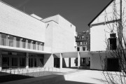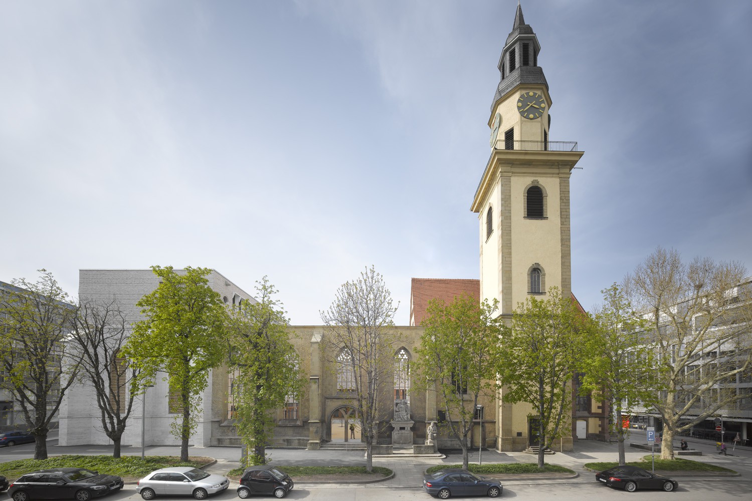 Wolf Irion, architect of the post-war building, had placed the main entrance to the educational centre along Büchsenstrasse. That is a thought that we followed in principle. But we have set it back further into the site, at the intersection with the church. At this point we would like to expressly acknowledge the work of Irion, because his design was a very nice contribution and a good example of post-war architecture in Stuttgart. The demolition is therefore not, for example, due to any dissatisfaction with the form of the ensemble: the reason lay in the dilapidated structure and the fact that the building was no longer able to satisfy diverse requirements, such as those for fire protection. In any case, rehabilitation would have only been possible, if at all, by expending a disproportionate effort. The essential portions of the underground garage were able to be retained, however, even though this has nothing to do with the underlying issue of the architecture.