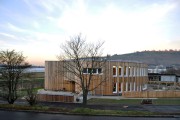 The choice of materials reveals a distinct dialogue between raw and fine. Outside, the building has been clad with naturally finished recycled wood. All the other elements, such as windows and exterior soffits, are painted white. Inside, exposed masonry in the cloakroom areas and exposed concrete ceilings are contrasted with parquet flooring and scumbled coloured walls in the group rooms.