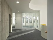 With its wooden doors and board-formed exposed concrete surfaces, the solid core appeals to the senses and contrasts with the partially glazed corridor walls, light ceilings and wall surfaces. Their restrained color scheme forms the calm background for the work, accentuated by the sunny yellow tones of the curtains and stair stringers. The “zigzag window elements” of the ribbon façades make the pleasantly open and light rooms appear even larger and lead the view out of the room towards the valley.