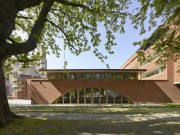 The third volume directly adjoins the Church of the Resurrection over two storeys. The classrooms and canteen are accessible by foot across a courtyard (the “Sing Garden”) that opens to the Domsingschule and through a passageway to the forecourt of the church, while access to the housing units is from the north via Clarenbachstraße.