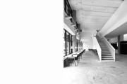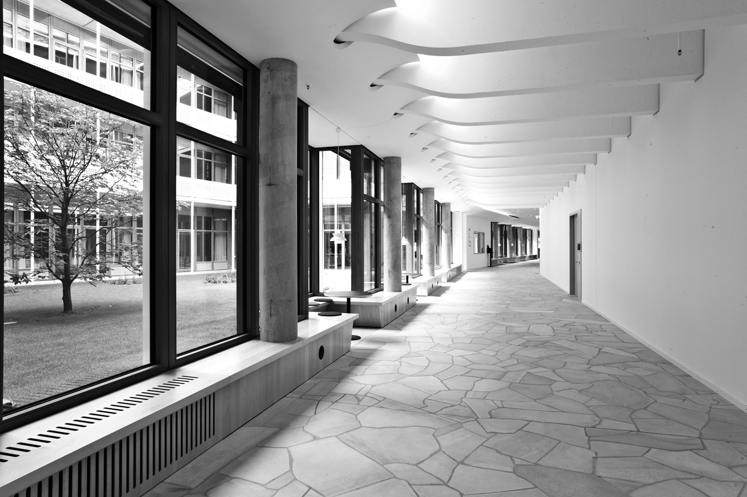 Die Büroflächen, die sich überwiegend in den Obergeschossen befinden, werden über vier Haupttreppenhäuser entlang der „Magistrale“ erschlossen. Weitere Treppenhäuser befinden sich in jedem zweiten Kreuzungspunkt des Gebäudes. In direkter Umgebung der Treppenhäuser, als zentrale Punkte, befinden sich die allgemeinen Funktionen wie Teeküchen, Kommunikationszonen und Sanitärbereiche.