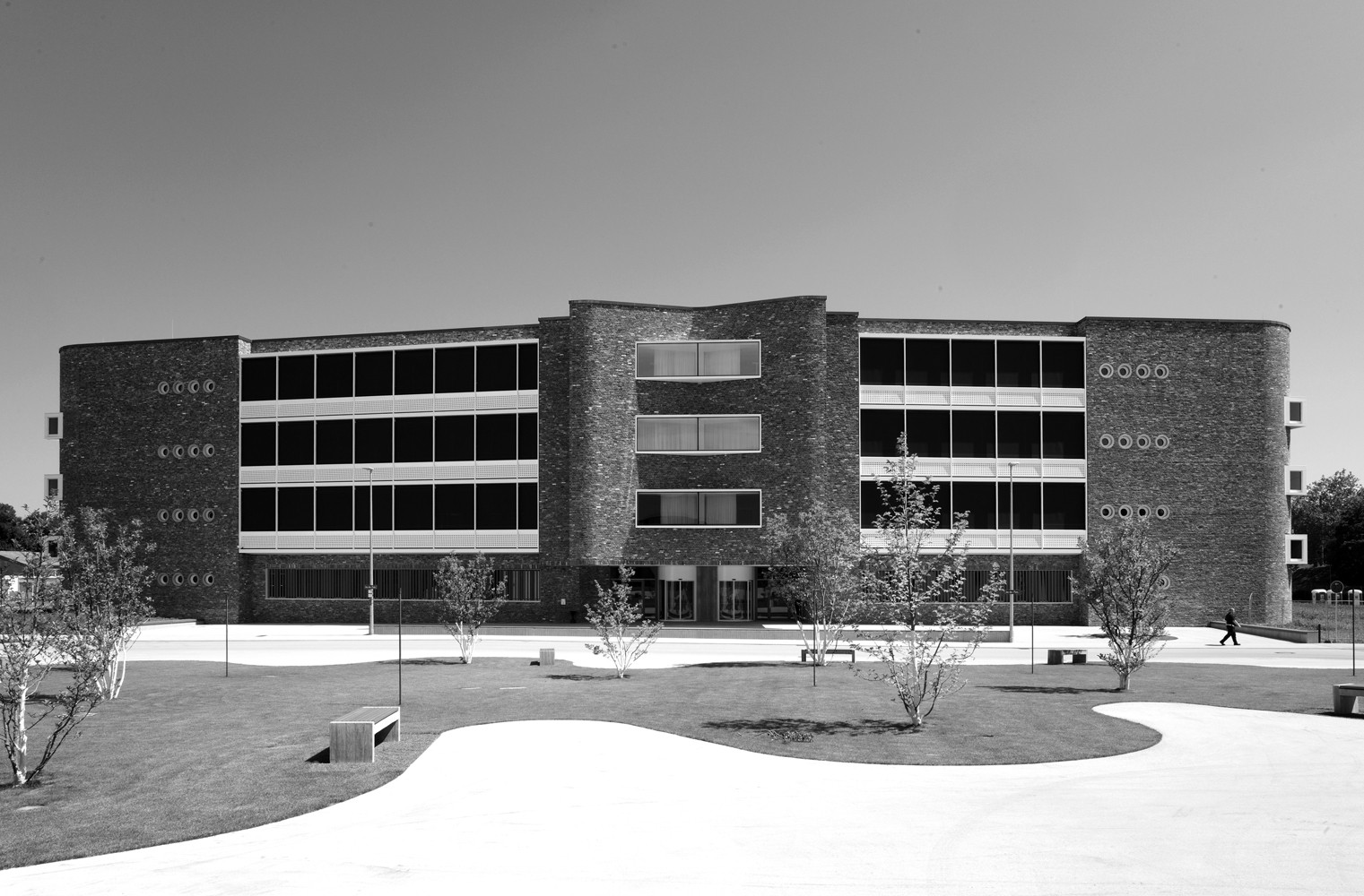 Fährt man durch die Allee von Durlach nach Karlsruhe, so hat man, trotz der Trennung durch die Autobahn, das räumliche Erlebnis eines Grünraumes, der Durlach selbst von Karlsruhe trennt. Diese stadträumliche Qualität galt es zu bewahren. Für die Architektur bedeutete das, die Gebäudehöhe so niedrig wie irgend möglich zu halten. Dieser Umstand verhilft dem Unternehmen zugleich, die Büroflächen möglichst flächenhaft zu halten, also nicht zu stapeln, um damit dem Wunsch nach einer möglichst hierarchiefreien Arbeitswelt Rechnung zu tragen. Insofern gehen in diesem Falle die städtebaulichen Wünsche und die räumlichen Anforderungen, die in der Unternehmenskultur begründet sind, symbiotisch zusammen.