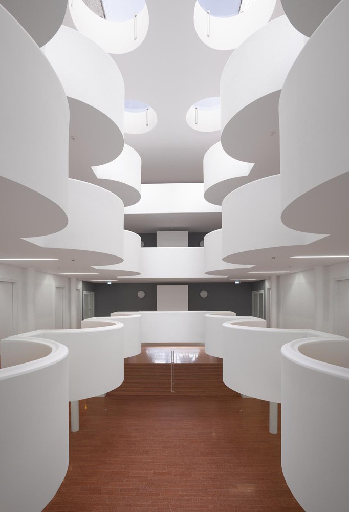 Vom neuen Ensemble soll eine ähnliche Klarheit ausgehen, wie wir sie in den Plänen von 1774 und 1659 vorgefunden haben, dazu orientiert sich der zentrale Baukörper mit seinem Volumen an der St. Josephskirche. Seine Südfassade erinnert an die Komposition des plastisch geformten Kirchenbaus. Die große von oben belichtete Halle, die für unterschiedliche Veranstaltungen der Diözese zu nutzen ist, öffnet sich zur Stadt. Sie ist Auftakt und Gelenk, das alle Einrichtungen und Abteilungen der gesamten Anlage miteinander verbindet und kann bei besonderen Anlässen bis in den Hof und den anschließenden Straßen- und Platzraum der Oberen Gasse, erweitert werden.