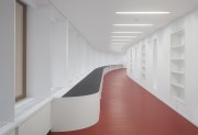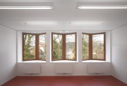 Zur Nordseite hin verbindet ein langer Büroriegel, im gleichen Abstand wie einst die Stadtmauer sämtliche Baulichkeiten der Gesamtanlage. Das Problem langer Baukörper, der mit der Größe einhergehenden Monotonie, die aufgrund der inneren Bedingungen, im Fall der Büronutzung, mit einem Raster verbunden ist, wird mit einem Rhythmus, welcher die Enden gesondert behandelt und der in Zickzackform entworfenen Fensterbänder gelöst.