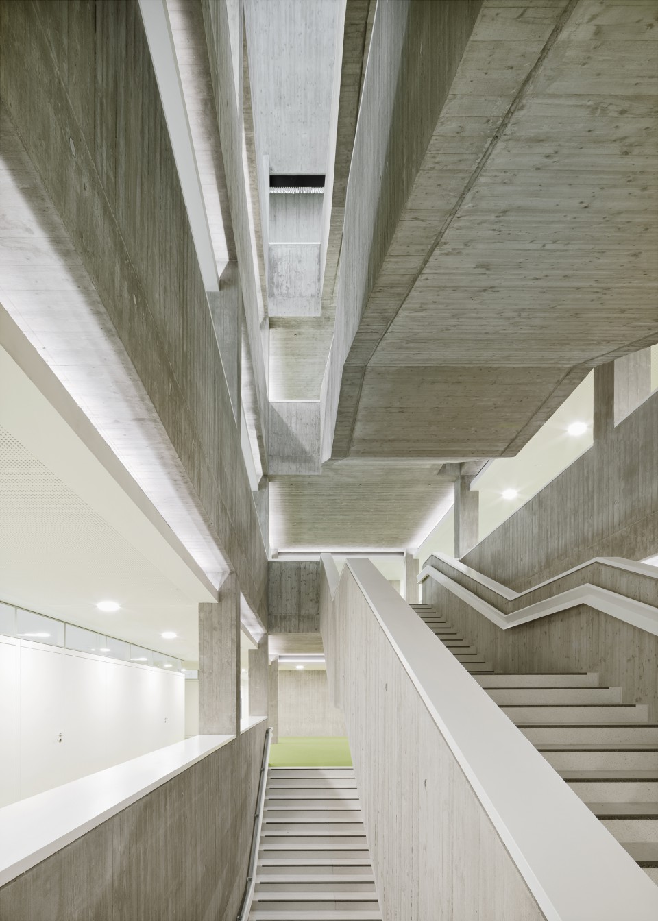 Im Inneren des Gebäudes wurde aus Kostengründen auf die helle Einfärbung des Betons verzichtet. Besondere Herausforderung war die Betonage der Sichtbetontreppe im Bibliotheksbereich und der Z-förmigen, weitspannenden Träger des nach Norden verglasten Sheddachs im vierten Obergeschoss. Auch hier erfolgte die Schalung handwerklich mit sägerauen Brettern auf Trägerschalung. Auf Matrizen mit wiederkehrenden Schalbildern wurde im gesamten Gebäude verzichtet. So ist die Anstrengung und die Kunstfertigkeit der Schalungsbauer in der Qualität des Sichtbetons ebenso sichtbar wie die Wetterbedingungen zum Zeitpunkt der Betonage. Den rauen und lebendigen Sichtbetonoberflächen sind die weißen, glatten Oberflächen von Abhangdecken und Holzverkleidung gegenübergestellt. Hellgrüner Teppichboden und weiße Möblierung erzeugen eine helle, heitere Atmosphäre, die im Gegensatz zu den gedeckten Farbtönen des Bestandes steht.