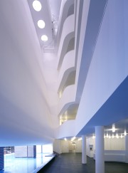 Im Erdgeschoss findet sich gegenüber dem Haupteingang eine 1,60 Meter hohe, über die gesamte Gebäudebreite reichende Fensteröffnung. In Längsrichtung teilt sie ein gleich breites Wasserbecken, das den Außenraum mit dem Inneren der Halle verbindet. Darüber erhebt sich eine sich nach oben hin zunehmend neigende Wand, die durch runde Oberlichter beleuchtet wird. Ihr unterer Abschluss ist gerundet und reflektiert die Spiegelungen des hellblau beschichteten Wasserbeckens. Die Halle ist weiß gestrichen, sich ständig verändernde Farbakzente werden lediglich auf den Innenwänden gesetzt, und zwar durch den Widerschein der Wasserfläche.