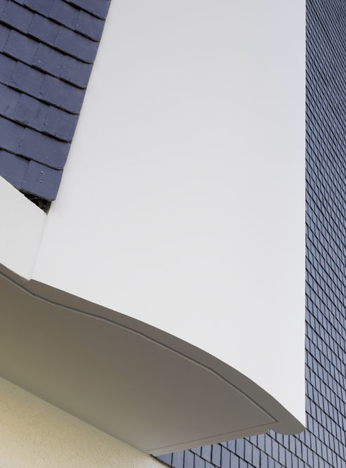 Das Grundstück liegt in einem Quartier, das zu den Straßenräumen hin durch eine Blockrandbebauung der Wende zum 20. Jahrhundert geprägt ist. Mit der verhältnismäßig großen Baumasse versuchten wir, diese Struktur fortzusetzen und zu stärken. Die Staffelung des Dachgeschosses gestattet den Übergang von den höheren Gebäuden im Westen zu den alten Nachbargebäuden auf der anderen Seite. Dort gibt es einen durch Mauerscheiben gebildeten Eingangshof, von dem aus man das Gebäude betritt. Die Obergeschosse erhielten eine Verkleidung mit Schieferplatten, der Sockel ist weiß verputzt.