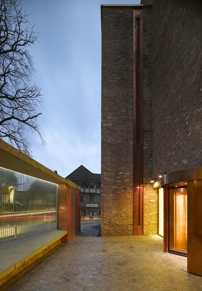 Das neue Museum wirkt auf den ersten Blick vertraut. Sowohl die städtebauliche Einbindung, als auch die Materialität des recycelten Ziegelmauerwerks, erzeugen diese Doppeldeutigkeit, welche auf die Besonderheiten des zentralen Ortes reagiert. Das einfache räumliche Konzept also, Eingangshof, rechteckige und neutrale Ausstellungsräume, die von den Erschließungselementen in die Mitte genommen sind, wird nach außen durch eine Schale aus Recyclingziegel gemauert. Das Dach ist aus Ziegelschalen gebildet, die als Gewölbekonstruktion den Raum frei überspannen.