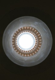 Am hinteren Ende des Gebäudes gelangt man durch eine Außentüre in den Garten. Zusätzlich erhalten auch die Gruppenräume einen direkten Zugang in den Freibereich. Der Mehrzweckraum erhält eine eigene Terrasse, die zu den Feldern hin orientiert ist. In der Mitte des Gebäudes befindet sich ein zentraler Garderobenbereich, der außerdem über zwei runde Lufträume mit dem Obergeschoss verbunden ist. Von hier aus gelangt man zu den Gruppenräumen und dem Mehrzweckraum. Im Obergeschoss befinden sich die Gruppen- und Schlafräume für die älteren Kinder und eine Küche für die Essenszubereitung für die Ganztagsgruppen mit zugehörigen Nebenräumen. Auch vom Obergeschoss ist ein direkter Zugang in den Garten über die rückwärtige Außentreppe möglich.