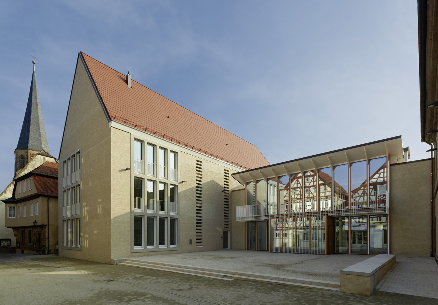 Das in der Altstadt gelegene Rathaus war vor Jahren schon zu klein geworden, was zur Auslagerung einzelner Funktionen geführt hatte. Der Wunsch, die wesentlichen Ämter wieder im Zentrum unter einem Dach zu vereinen, führte zum Wettbewerb und schließlich zum Neubau neben dem bestehenden barocken Rathausgebäude. Das Grundstück ist so bemessen, dass wir den Verwaltungstrakt mit maßvollem Abstand zum Altbau anordnen konnten, wodurch sich zwischen beiden Gebäudeteilen ein kleiner Platz ergab. Der Sitzungssaal mit Bürgerbüro wurde im selben Zuge von der Straße zurückversetzt. So konnte der bereits vorhandene Platz vor dem alten Rathausbau mit dem neuen Platz bajonettartig verknüpft werden.
