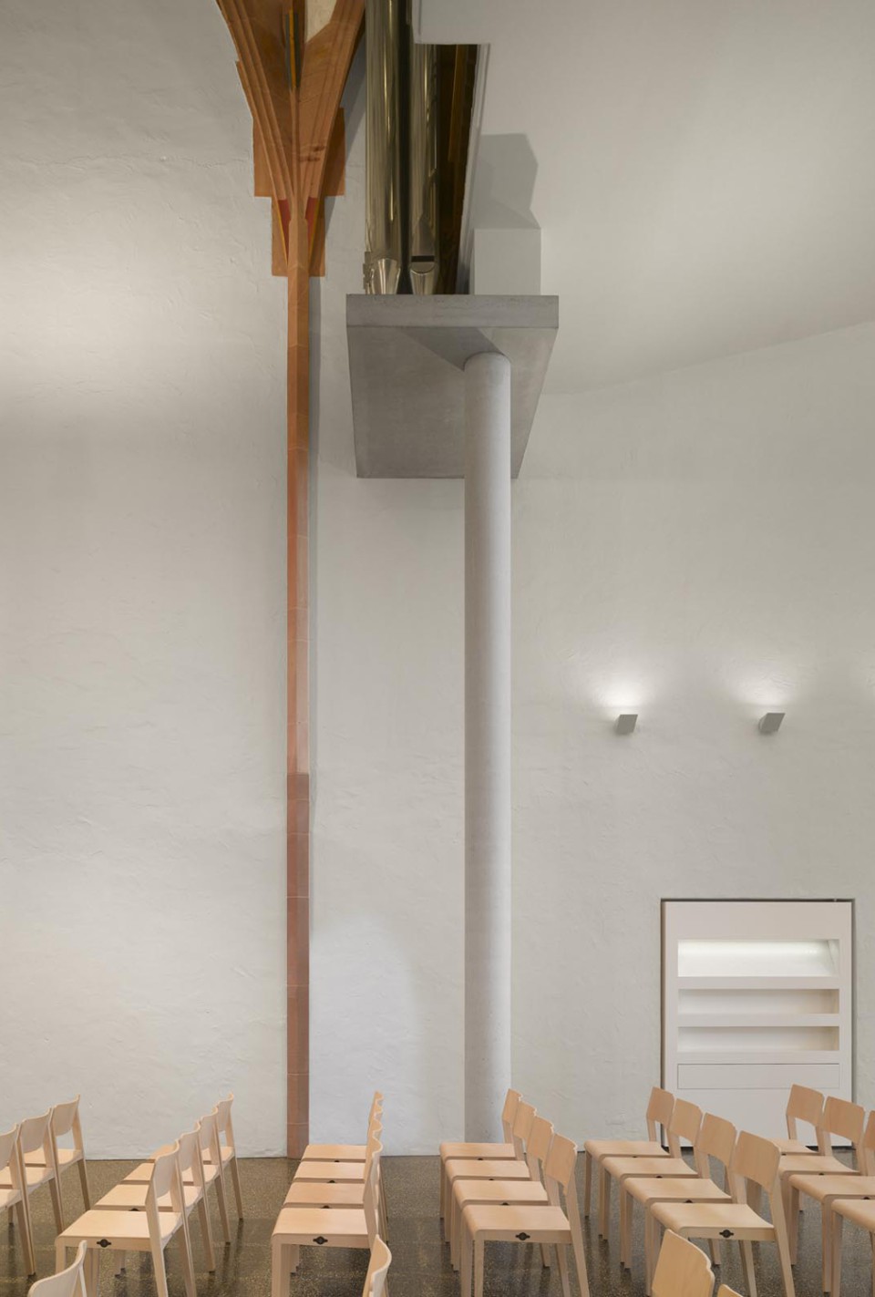 Die Orgelempore musste durch den Ausbau der unteren Empore durch neue Konsolen und zwei schlanke Betonstützen abgefangen werden.