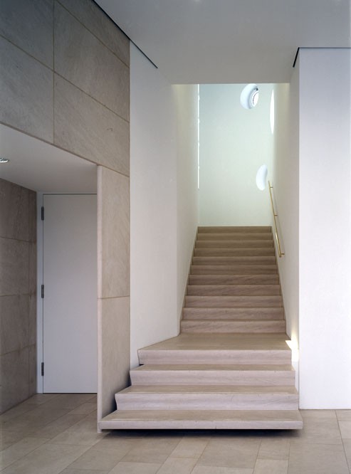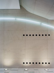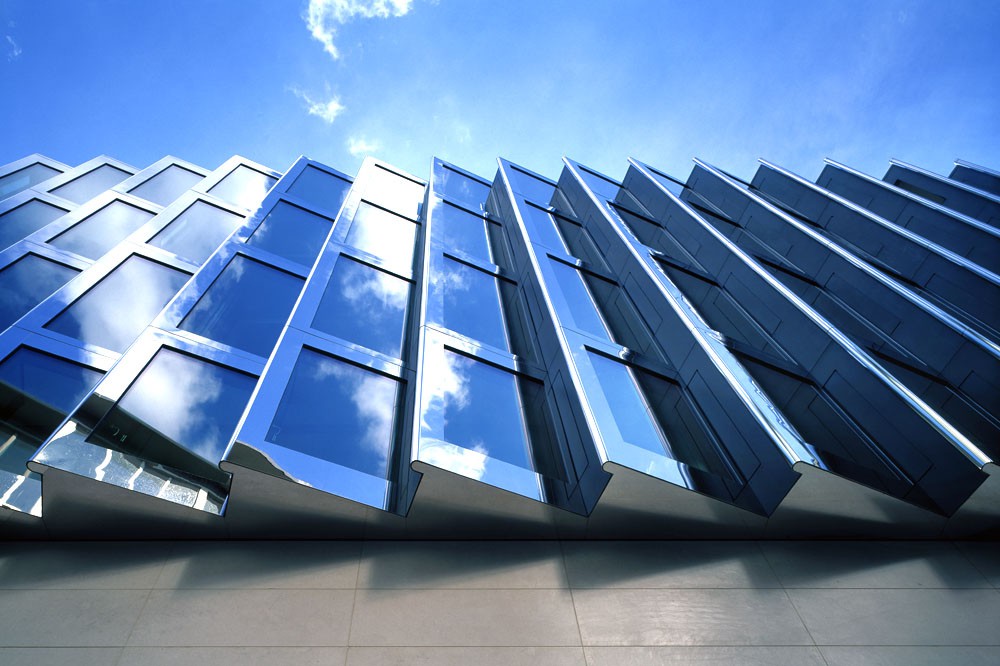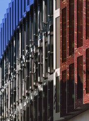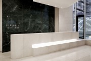 Das Gebäude ist mit hellem Kalkstein verkleidet, der auch im Eingangsbereich – an Boden, Wänden und Decke – Verwendung fand. Die neue Bürofassade aus poliertem Metall ist gefaltet. Im Westen weist sie eine geschosshohe Verglasung, im Osten geschlossene, schwarz beschichtete Lüftungsflügel auf.
