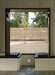 Durch die geschwungene Grundrissform ergab sich im Erdgeschoss ein Rücksprung, der mit einer Mauer aus Abbruchziegeln zur Grundstück und Park trennenden Straße hin geschlossen wurde. Der so entstandene Innenhof dient der Meditation. Im Kontrast zur Mauer ist die Fassade des neuen Gebäudes mit einem groben weißen Putz versehen. Die Fensterprofile sind aus Eichenholz.