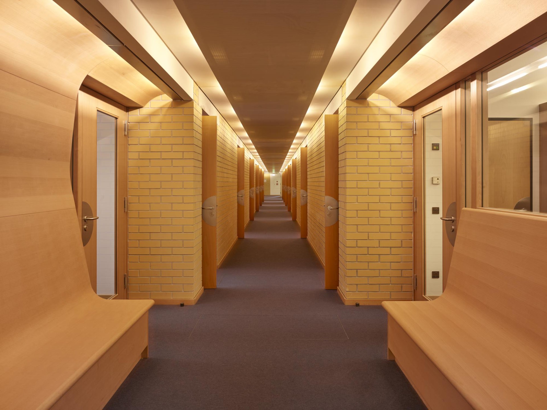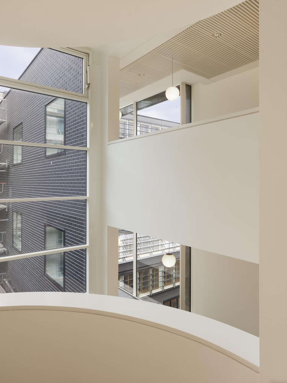 Bürogebäude und Hotelneubau bilden jeweils ein „U“ um einen Innenhof herum, voneinander getrennt durch das bestehende Stegbauwerk an der Nahtstelle. Der obere Innenhof auf Höhe der Jägerstraße wird ausschließlich von den Mitarbeitenden des Verwaltungsgebäudes genutzt. Der untere Hof liegt knapp 4 Meter tiefer und ist der Hotelnutzung vorbehalten. Mit überdachten Terrassen, bepflanzten Rabatten und begrünten Fassaden bietet er eine hohe Aufenthaltsqualität für die Gäste. Das Hotel bespielt darüber hinaus die Straßenecke Kriegsberg-/Goethestraße mit einer öffentlichen Außenterrasse und einem Zugang zur Hotelbar.