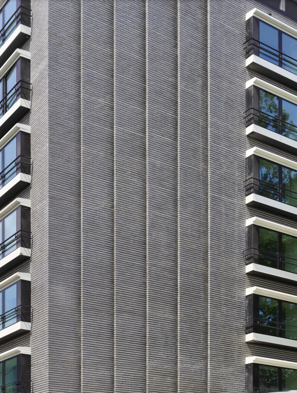 Der Hotel-Neubau orientiert sich in der Gebäudehöhe am bestehenden Verwaltungsbau. Die vorhandenen Straßenkanten werden ebenso aufgenommen wie das Farb- und Materialkonzept. Die Fassade aus nahezu schwarzem Klinker mit Betonung der Horizontalen durch weiße Lagerfugen greift auf den Neubau über. Auch die horizontale Gliederung durch die über die Mauerwerksfassade hervortretenden Fensterbänder wird übernommen. Der ganz durchgebrannte und dadurch bläulich-schwarze, englische Stein wurde ursprünglich im Kanalbau verwendet und in den 1990er Jahren ausnahmsweise im Normal- statt im englischen Format hergestellt. Nach langer Recherche konnte für den Neubau ein identischer Stein bei einem deutschen Hersteller gefunden werden.
