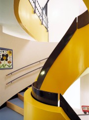 To meet the need for space despite the restricted circumstances, we rounded off the nursery school’s ground plan. We have inserted a round stairwell into the building to serve as the main access connecting the levels. Right at the building’s entrance, the children can see up into the attic. The entry floor and the first floor each accommodate a group, with its main and ancillary rooms. The attic accommodates a space for physical exercise. In front of the entrance is an adjoining building raised on pillars. Here children can take shelter from bad weather while they are waiting outside.