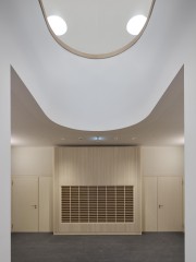 The third volume directly adjoins the Church of the Resurrection over two storeys. The classrooms and canteen are accessible by foot across a courtyard (the “Sing Garden”) that opens to the Domsingschule and through a passageway to the forecourt of the church, while access to the housing units is from the north via Clarenbachstraße.