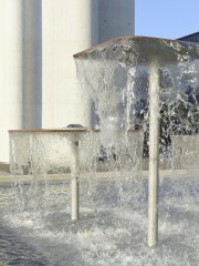 Hanspeter Fitz combined steel pipes with copper plates so that water flows out of the pipe openings and falls like a veil from the edges of the plates. This creates luminous walls of water that form transparent spaces. They unfold in a continuous vertical movement and react to every breath of air from the side. Added to this is the pleasant sound of water, which drowns out the noise of the busy main road and creates an acoustically sensual place with a high quality of stay between the cultural institutions.